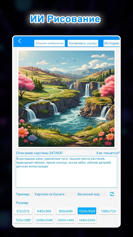 Введите текстовое описание, и система создаст изображение по вашему запросу — от абстрактного арта до портретов и пейзажей. Безграничное поле для творчества.