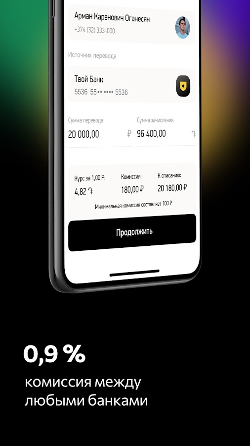 Комиссия — 0.9% и минимум 100 руб. независимо от страны и банков отправителя и получателя. Размер комиссии и актуальный курс обмена валют вы сможете увидеть в приложении перед совершением перевода.