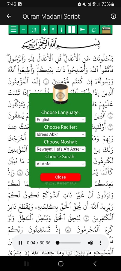 2. Полный письменный шрифт Корана Усмани для чтения Корана в автономном режиме с автоматической прокруткой