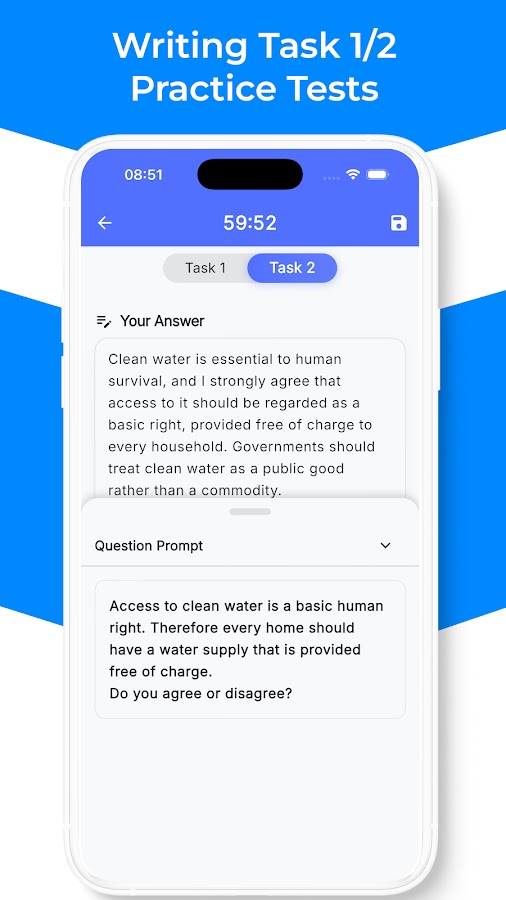 — Таймер имитации реального экзамена: тренируйтесь в условиях реального экзаменационного стресса с помощью встроенных таймеров обратного отсчета. Эффективно управляйте своим временем для разделов «Чтение» и «Письмо».