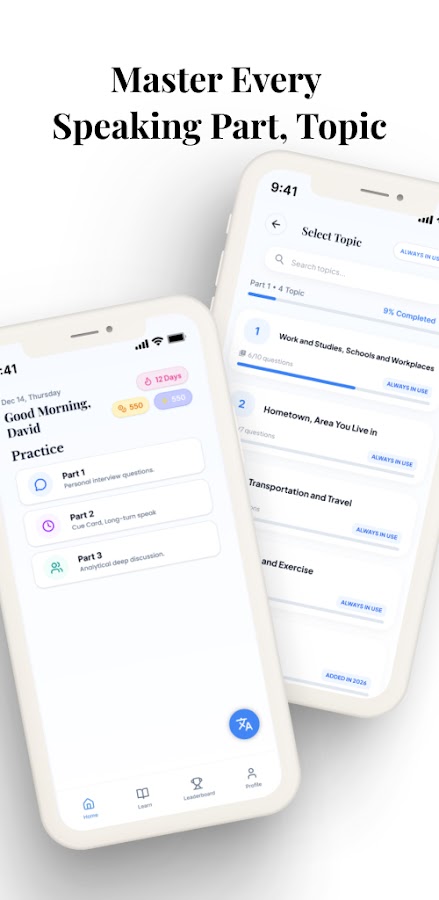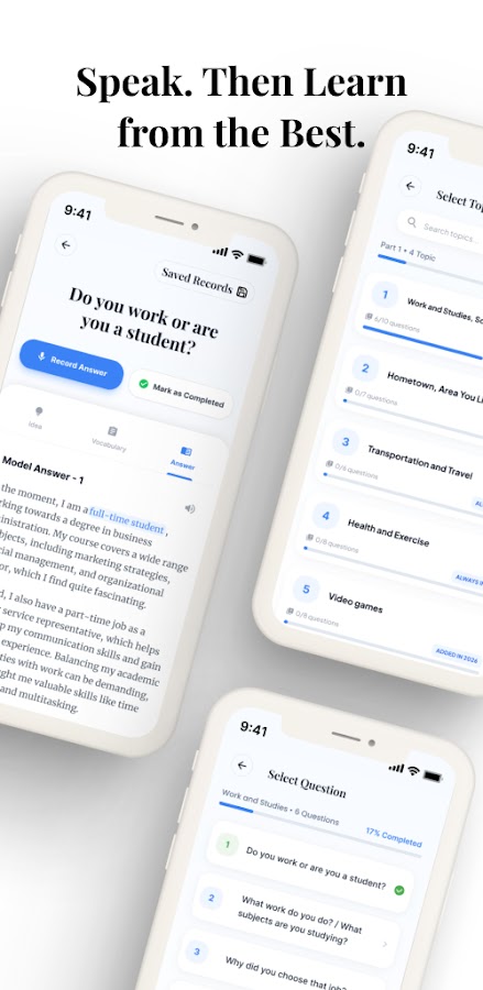 Выбирайте из широкого спектра тем IELTS, таких как работа, образование, путешествия и многое другое. Практикуйтесь говорить на темы, которые наиболее важны для вас, и с легкостью развивайте беглость речи.