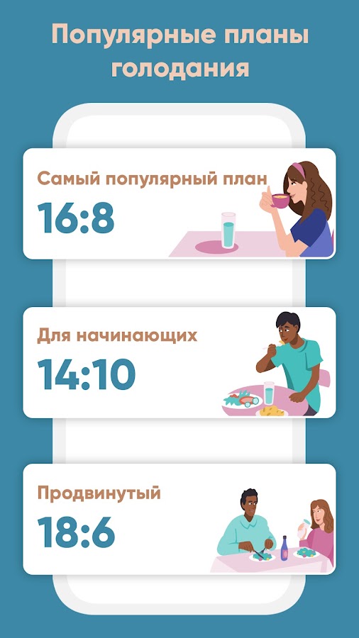 * Отслеживание голодания: трекер голода (трекер голодания) подскажет, когда можно есть. Можно выбрать классический режим 16:8 или другой.