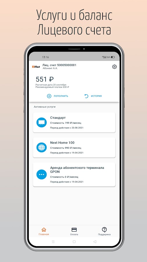 Узнайте сумму баланса на текущий момент, информацию о задолженностях по Лицевому счету, просмотрите историю списаний и пополнений