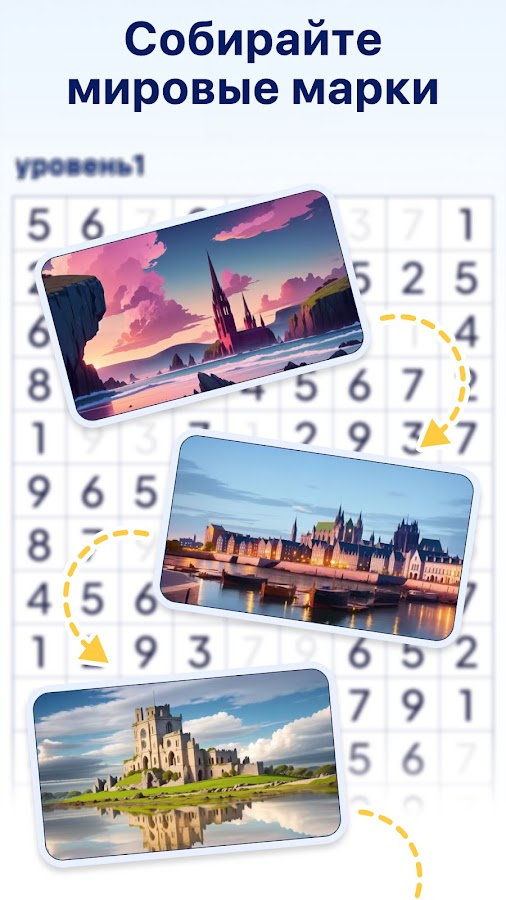 Это больше, чем просто числа! Проходите уровни, чтобы «путешествовать» по городам. От Эйфелевой башни до Статуи Свободы — решайте числовые головоломки и собирайте уникальные марки. ✈️