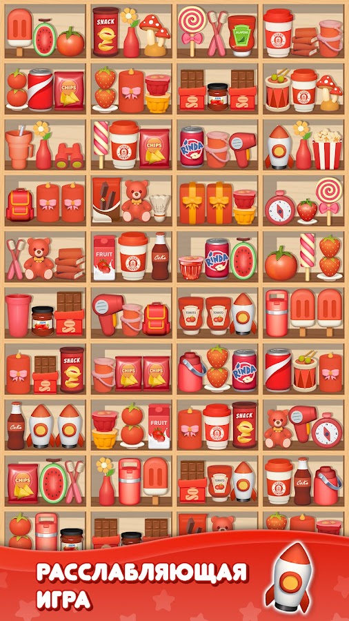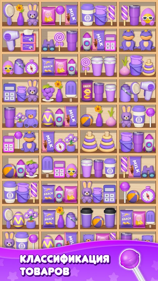 ✨ Сложный геймплей сортировки: Погрузитесь в мир товаров и вступите в захватывающие головоломки сортировки. Меняйте местами и соединяйте 3 или более одинаковых товара, чтобы очистить их с доски и заработать очки.