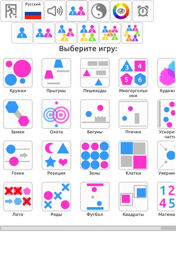 Сборник, включающий игры для одного, двоих, троих, четверых, пяти или шести игроков, в которые можно играть на одном устройстве (телефоне или планшете). В играх очень простые правила. Можно играть без интернета / вайфая, потому что мультиплеер здесь локальный, оффлайн, на одном девайсе.