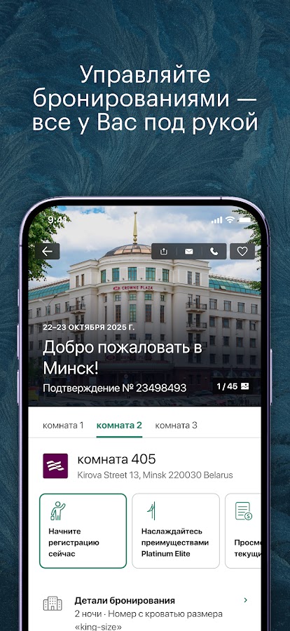 С помощью приложения IHG One Rewards можно просматривать всю информацию о своей поездке, получать напоминания о поездке, изменять или отменять бронирование, а также контролировать расходы по текущему проживанию. Нужен маршрут, информация о парковке или список удобств отеля? Приложение поможет вам в этом.