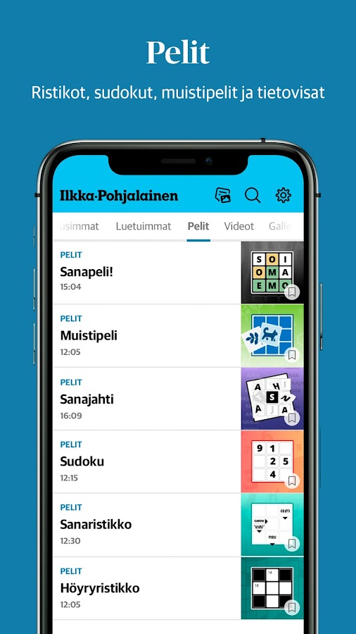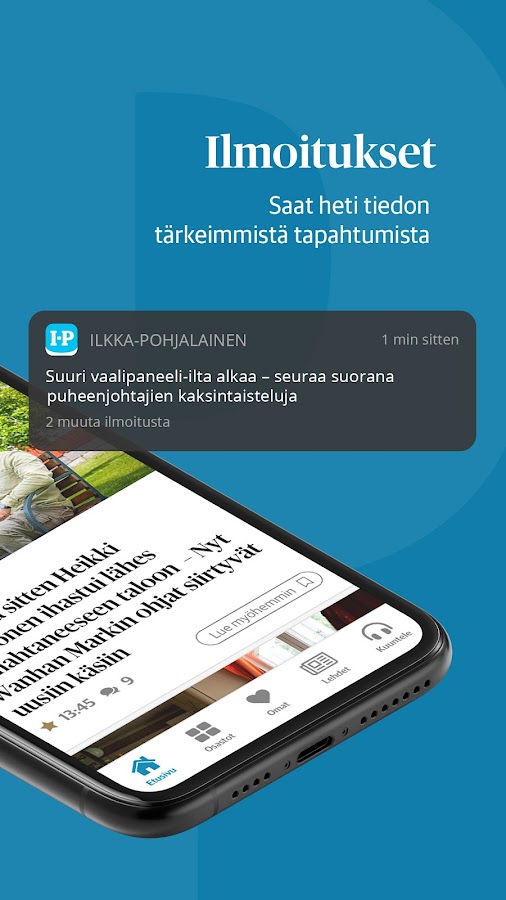 Ilkka-Pohjalainen — голос Остроботнии и Южной Остроботнии, всегда с вами. Скачайте приложение и читайте постоянно обновляемую новостную ленту, визуальные журналы и разнообразные онлайн-статьи с фотографиями и видео. При желании вы можете получать уведомления о самых важных новостях и легко находить интересующий вас контент. В приложении вы также можете разгадывать кроссворды и судоку, а также пользоваться преимуществами подписки Ilkka-Pohjalainen. Ilkka-Pohjalainen предлагает вам местные новости, статьи и мнения — всё в одном удобном приложении.