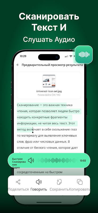 Наше приложение работает на основе новейшего сканера изображений OCR, что обеспечивает максимальную точность преобразования изображений в текст. Он эффективно сканирует текст и точно обрабатывает даже размытые или изображения с низким разрешением.
