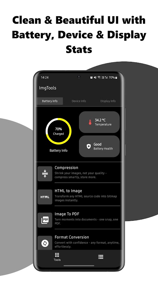 ImgTools — это универсальное приложение для работы с изображениями, предназначенное для упрощения задач по работе с цифровыми изображениями с помощью мощных инструментов, собранных в одну легкую и удобную платформу. Независимо от того, являетесь ли вы студентом, профессионалом, создателем контента или просто человеком, который часто работает с изображениями, ImgTools поможет вам сжимать, конвертировать, улучшать изображения и управлять ими без особых усилий — и все это с вашего телефона!