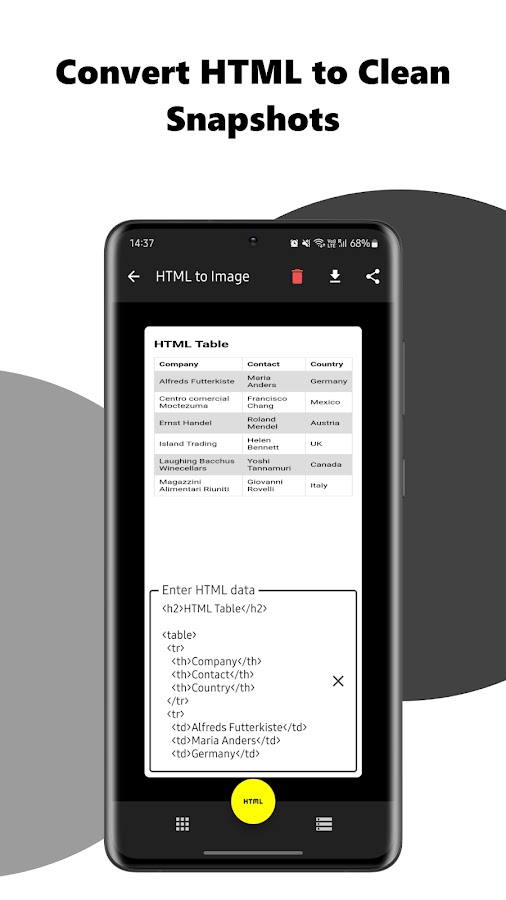 Легко конвертируйте необработанный HTML-код в формат изображения. Идеально подходит для разработчиков или для визуального сохранения фрагментов кода.