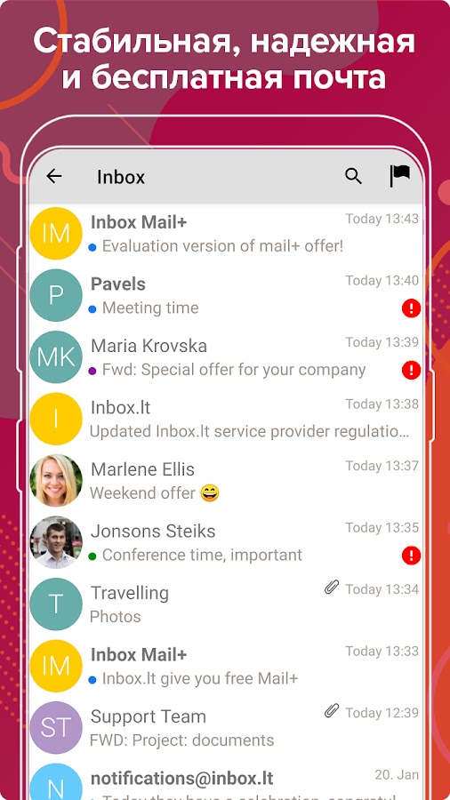 Inbox.lt это стабильный, безопасный и мощный почтовый сервис с более чем миллионом довольных пользователей. Размещен на собственных серверах в Европе. Наши приложения для Android и iOS телефонов, помогают сделать Вашу работу еще удобнее и мобильнее.