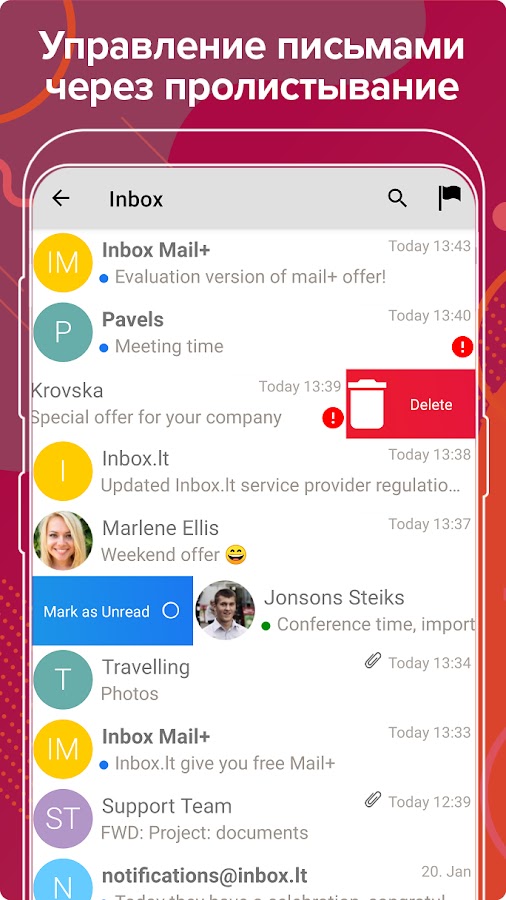 • Жесты прокрутки (swipe) – мгновенное удаление письма или отметить как непрочитанное