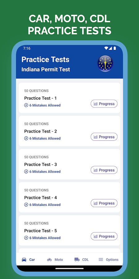 Готовитесь ли вы к экзамену на получение водительских прав для учащихся или экзамену на получение водительских прав в штате Индиана? Наше удобное приложение Indiana BMV Permit Test Practice позволяет вам попрактиковаться в вопросах, гарантируя, что вы хорошо подготовлены и легко пройдете тест DMV. Приложение служит учебным пособием для предстоящего теста на получение разрешения IN.