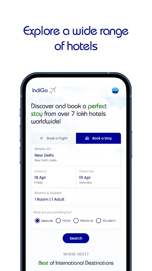 • Бронирование отелей класса люкс или бюджетных отелей — в приложении IndiGo Flight & Hotel есть всё.