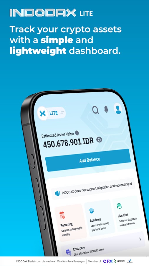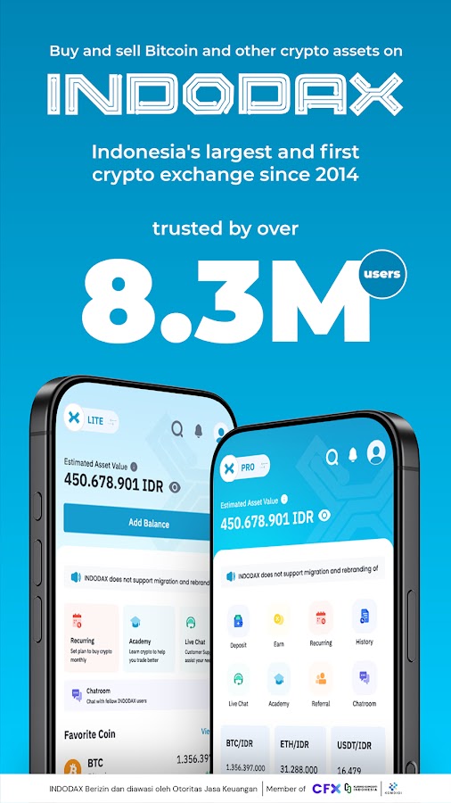 С более чем 9,8 миллионами зарегистрированных пользователей Indodax является крупнейшей и наиболее надежной платформой для торговли криптовалютами в Индонезии. Indodax официально зарегистрирована и находится под непосредственным контролем Otoritas Jasa Keuangan, а также является членом CFX. Компания также имеет международные сертификаты ISO 9001:2015, 27001:2013 и 27017:2015, гарантирующие максимальную безопасность. Наша круглосуточная служба поддержки клиентов всегда готова помочь вам в любой момент.