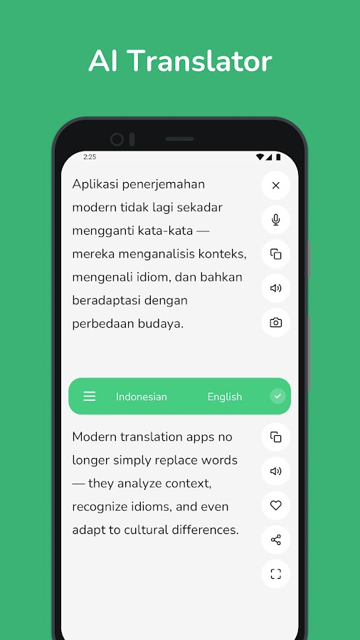 Благодаря нашему интуитивно понятному интерфейсу вы можете легко переводить слова, фразы и предложения с индонезийского на английский в режиме реального времени. Наш продвинутый искусственный интеллект обеспечивает точные переводы, учитывая нюансы обоих языков.