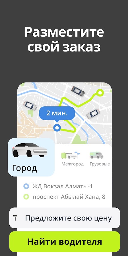Удобный и безопасный способ путешествовать в другие города. Укажите город отправления и город прибытия, где и когда вас забрать (дату, время и адрес), назовите цену и выбирайте из десятков выгодных предложений. Как заказ такси, только удобнее и проще!