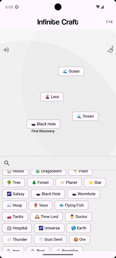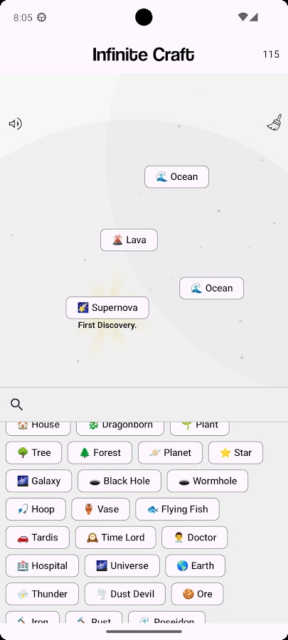 Создайте постоянно расширяющуюся вселенную предметов, концепций и явлений. Начиная с нескольких основных компонентов, таких как воздух, вода, огонь и земля, игроки смешивают и сопоставляют эти элементы, чтобы выковать новые открытия. Игра бросает вызов игрокам, чтобы мыслить творчески и стратегически, чтобы разблокировать все возможные комбинации, что приводит к сотням или даже тысячам уникальных предметов, начиная от осязаемых, таких как металлы и растения, и заканчивая концептуальными, такими как любовь и время.
