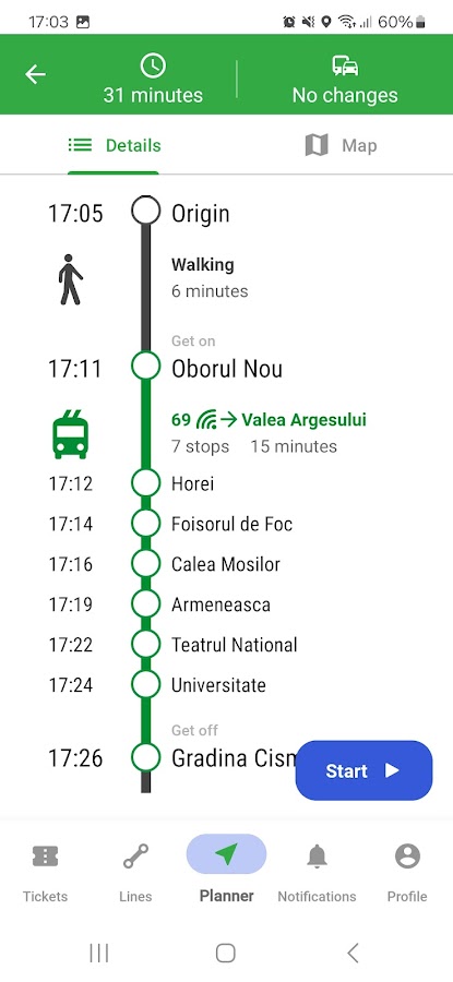 Путешественник может начать путешествие из текущего местоположения или из другого места на карте и выбрать пункт назначения, выбрав адрес, достопримечательность, желаемую станцию или даже поставив булавку на карте. Они также могут выбрать место, которое они ранее искали или добавили в избранное.