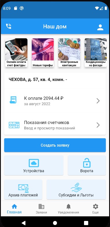 Приложение позволяет просматривать новости, начисления, оплаты, субсидии по лицевому счету и передавать показания счетчиков. Создавать заявки на обслуживание ЛС, получать актуальную информацию по заявкам в чате.