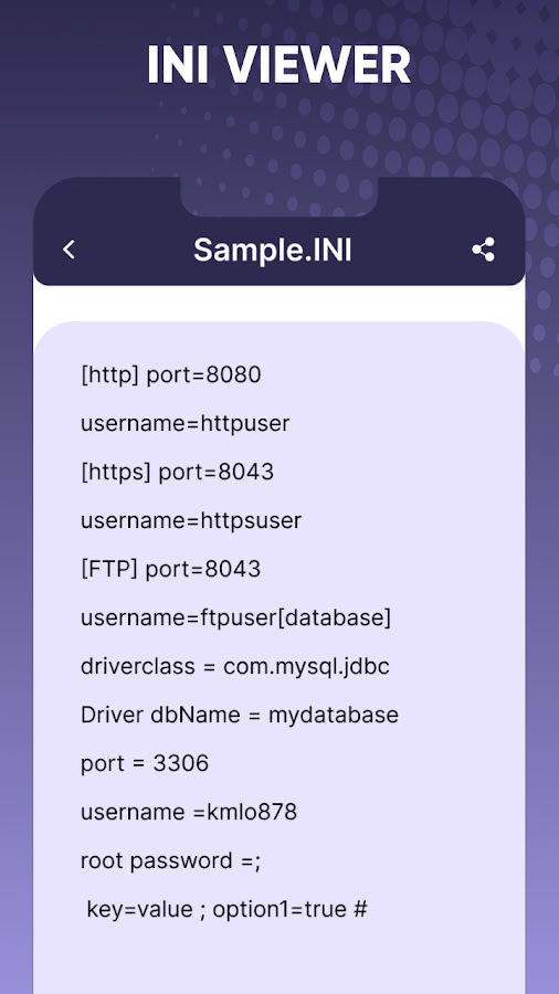 Добро пожаловать в приложение INI File Opener, наиболее комплексное решение для управления, просмотра и редактирования файлов конфигурации INI на вашем устройстве Android. Являетесь ли вы разработчиком, системным администратором или просто технически подкованным пользователем, приложение INI File Reader — ваш ключ к использованию всего потенциала INI-файлов. Раскройте весь потенциал файлов конфигурации вашего устройства с помощью INI File Viewer для Android, идеального инструмента для легкого управления и расшифровки файлов INI. Интерфейс INI File Manager для Android имеет четыре основные функции; включая программу просмотра файлов INI. выберите файл INI, преобразованный файл INI и последние файлы. INI File Reader and Editor — это приложение, адаптированное для мобильных устройств, которое весьма удобно для пользователя.