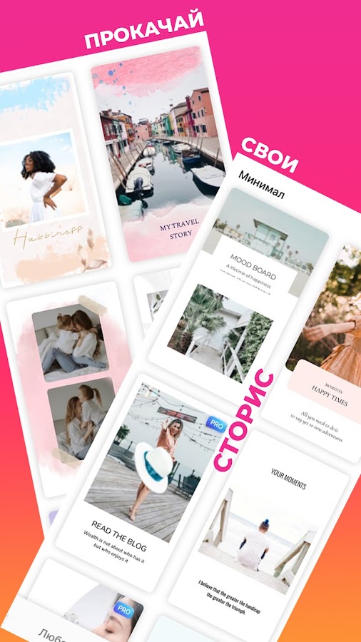 Instories доступен на IOS и Android. Первые 3 дня работают все инструменты и фильтры. По завершении пробного периода в бесплатной версии остается шаблон Minimal, базовые анимации, опция добавления стикеров, музыки и изменения фона. Для использования полного функционала программы необходимо активировать PRO-версию.