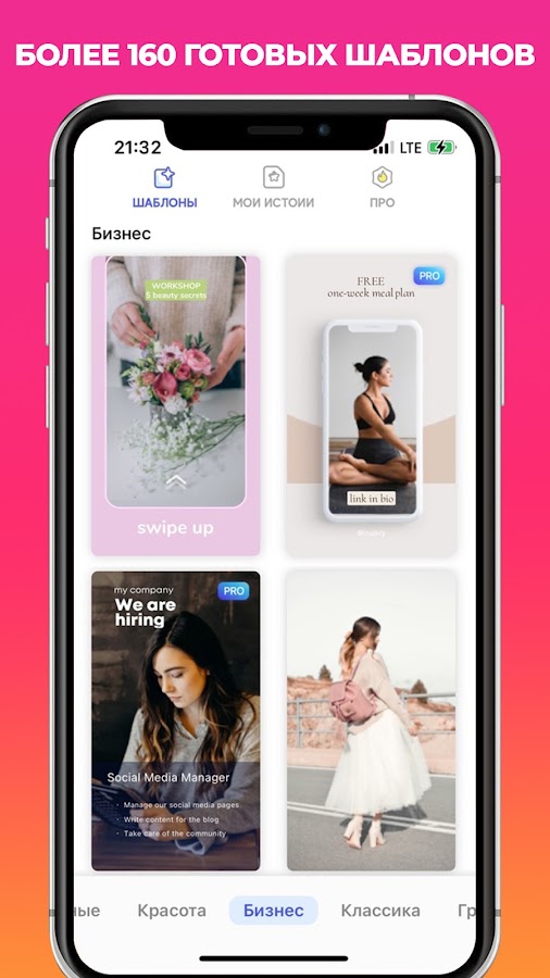 Подготовьте уникальные сторис, создание клип или клипы из фото, создайте Reels или привлекательные обложки для вашего Инстаграм, Snapchat, TikTok, Facebook, VK. Мы предоставляем широкий выбор шаблонов + фон которые могут быть легко персонализированы для вашего контента. Приложение для историй в Инстаграм делает обработку видео легче благодаря готовым дизайнам шаблонов, сформированным по категориям: простые, коллажи, красота, бизнес, минимал, любовь, типография, искусство, анимация текста. Множество коллекций анимированных стикеров, а также возможность изменения цвета фона или выбора динамического фона из библиотеки Inspiry или использования собственного файла.