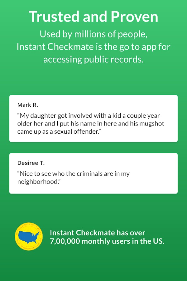 Быстро проверяйте людей на ходу с помощью приложения для проверки биографических данных Instant Checkmate. Законен ли онлайн-продавец? Стоит ли вам встретиться лицом к лицу с онлайн-матчем? Узнавайте больше почти обо всех — от знакомых вам людей до незнакомых. Посмотрите сами, чтобы узнать, что о вас «известно»!
