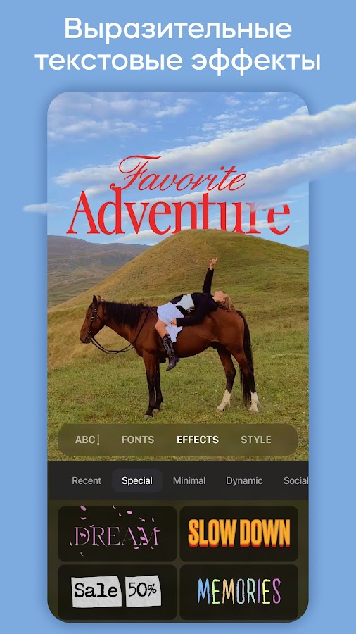 В приложении есть множество анимированных эффектов и шрифтов под любые цели Можно загружать и другие шрифты. С помощью анимированных надписей профессионально оформляются любые сторис с видео или фото.
