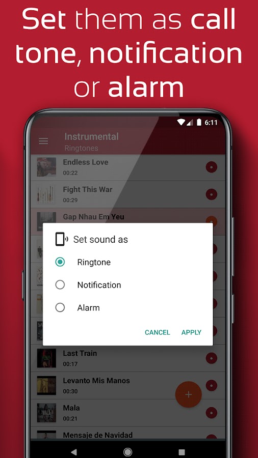 Это приложение бесплатно содержит сборник лучших лучших рингтонов Instrumental для телефона Android. Все звуки и песни были выбраны лично, поэтому вы можете загрузить лучшую коллекцию инструментальных мелодий для телефона, чтобы установить их в качестве мелодии звонка, сигнала будильника, сигнала сообщения или сигнала уведомления.