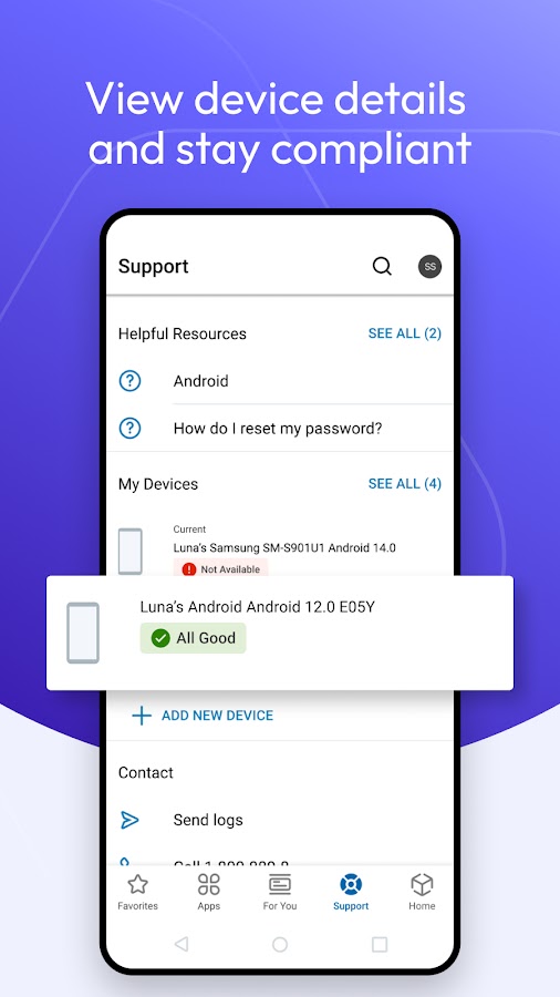 Intelligent Hub расширяет возможности управления мобильными устройствами (MDM) и управления мобильными приложениями (MAM) и позволяет вашей компании обеспечить безопасность, соответствие требованиям и подключение к вашему устройству. Вы также можете просмотреть сведения об устройстве, сообщения от ИТ-специалиста, а также проверить статус соответствия и запросить поддержку у своего ИТ-администратора.