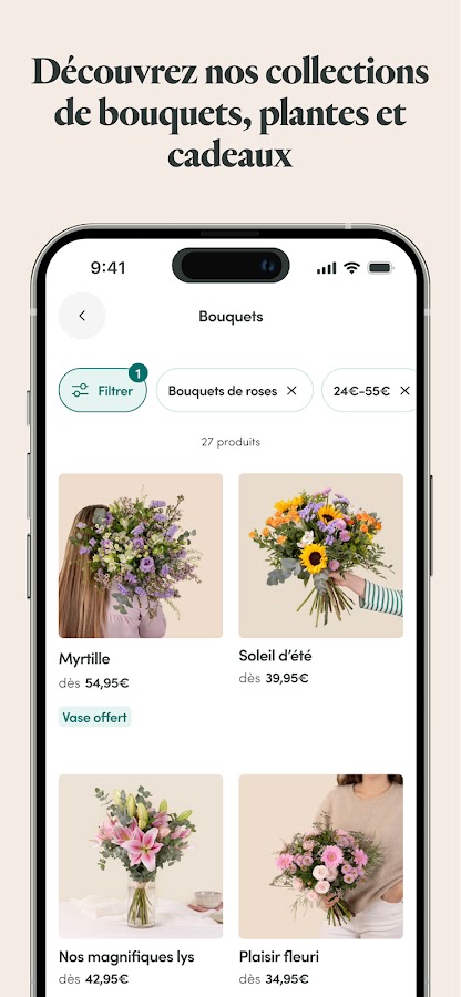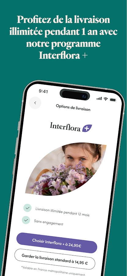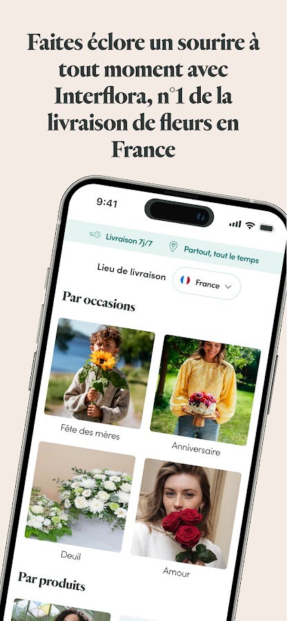 С приложением Interflora вы можете поделиться своими эмоциями одним жестом! Благодаря нашей сети из 5200 флористов-партнеров вы можете заказать исключительные букеты и композиции с доставкой 7 дней в неделю по всей Франции и более чем в 150 стран мира. Подарите момент радости, любви или утешения, не отрываясь от своего мобильного телефона.