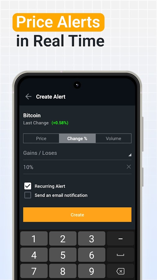 Пользуйтесь уведомлениями, чтобы немедленно узнавать о том, что цена пересекла определенный порог. Установите настраиваемые оповещения о ценах для выбранных вами экономических событий. Следите за значительными изменениями цен на ваши виртуальные валюты и цифровые активы.