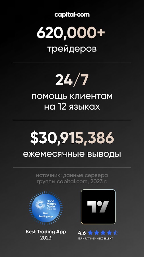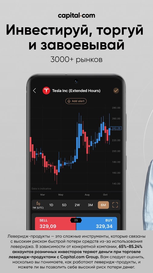 Откройте для себя удобное приложение для трейдинга, созданное, чтобы помогать вам открывать длинные или короткие позиции на тысячах рынков. Присоединяйтесь к более чем 750,000 пользователей по всему миру, которые выбирают Capital.com в качестве своего надёжного брокера, и торгуйте деривативами без необходимости напрямую инвестировать в активы — всё это в онлайн-приложении для инвестиций.