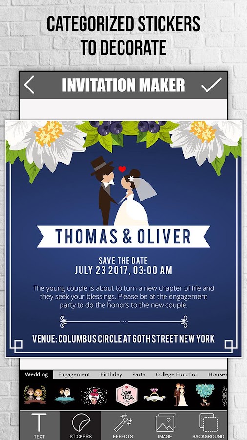 Invitation Maker — это быстрое и простое в использовании приложение для создания замечательных пригласительных билетов на ходу. Просто выберите понравившийся фон из красивой коллекции HD-фона, добавьте привлекательные стикеры из коллекции стикеров по разным категориям и напишите свой персонализированный текст с помощью нескольких профессиональных шрифтов. (вы также можете добавить свои собственные изображения на пригласительные билеты из вашей галереи или камеры.) И вот, пригласительный билет готов к выпуску.