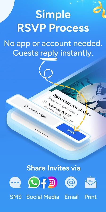 Отправляйте приглашения мгновенно по SMS или электронной почте, а также распечатывайте их для школьных занятий и семейных мероприятий. Гости подтверждают свое участие одним касанием — приложение не требуется.