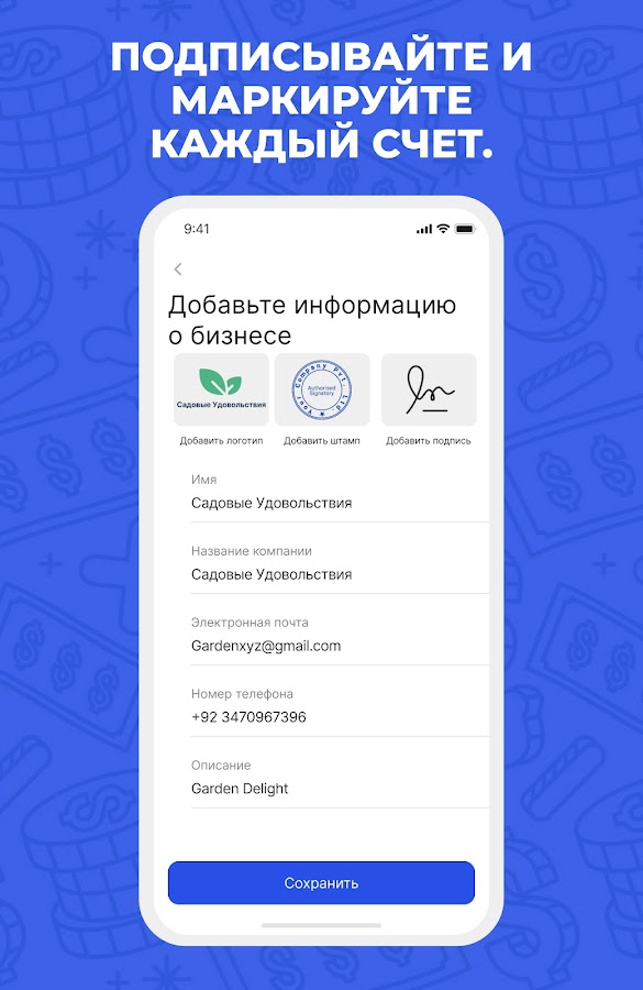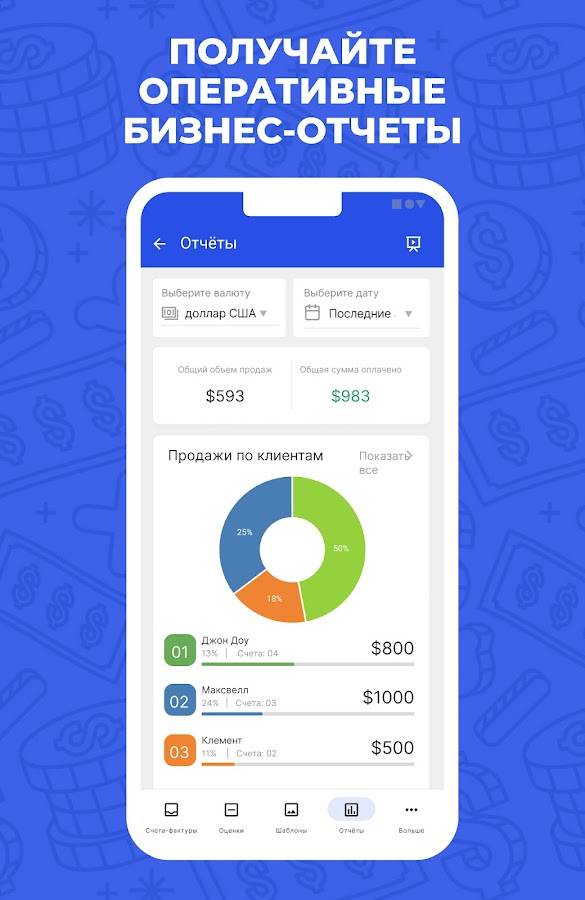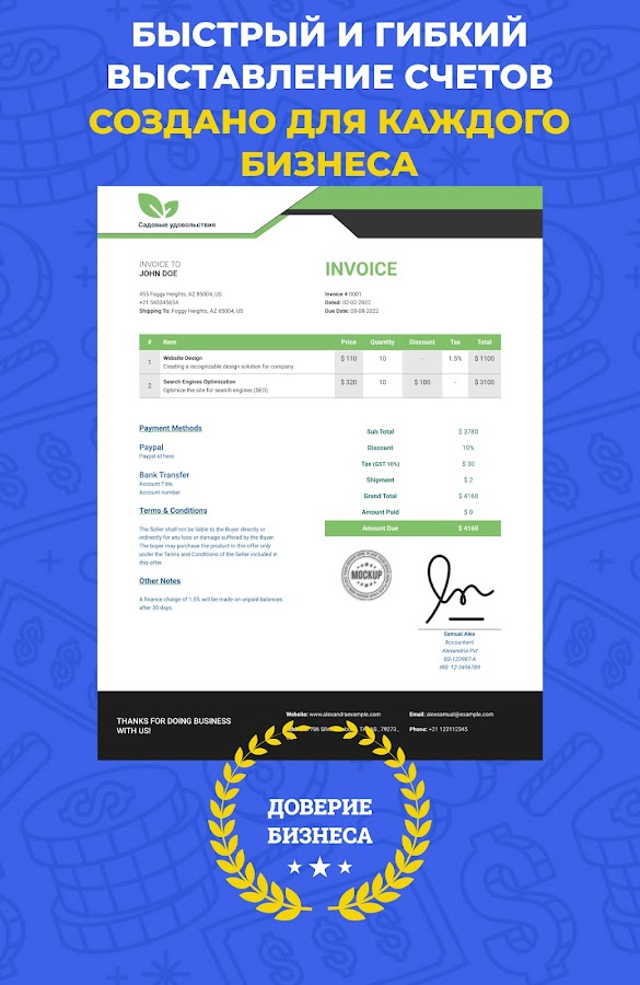 Invoice Billing — это приложение для создания квитанций или оплаты счетов, которое позволяет создавать и отправлять бизнес-счета и сметы вашим клиентам одним касанием пальца. С помощью этого простого генератора счетов вы получите четкое представление о своем денежном потоке, не пропуская при этом платежи. Выставление счетов клиентам с помощью шаблона счета-фактуры производителя квитанций позволяет управлять сроками и позволяет быстрее получать оплату.