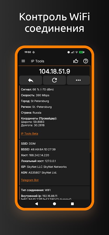 IP Tools имеет простой интерфейс, так что вы сможете за считанные секунды получить полную информацию о вашей сети, узнать локальный, внутренний или внешний ip адрес , SSID, BSSID, dns, время пинга, скорость wifi, сигнал, broadcast адрес, шлюз, маска сети, страна, регион, город, географические координаты провайдера (широта и долгота), whois, netstat и остальную информацию.