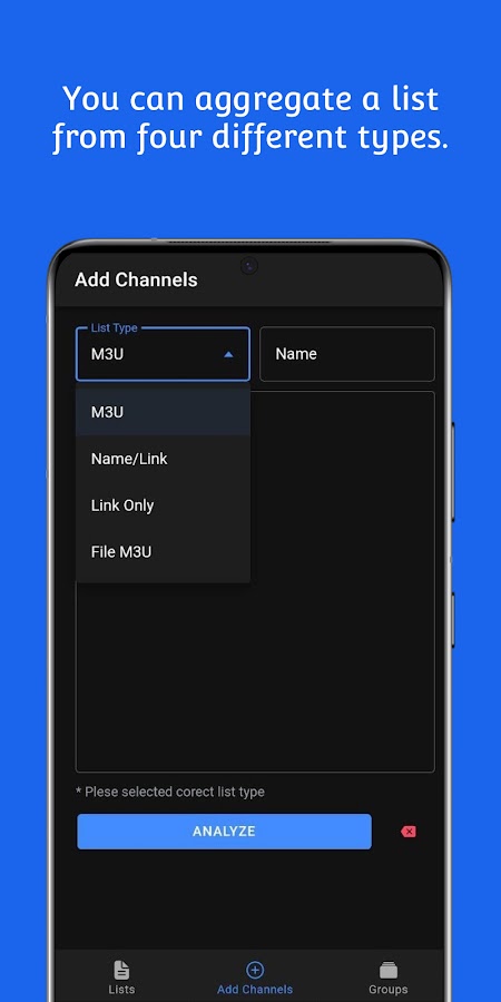 Добавить список IPTV, вы можете добавлять списки 4 разных типов: