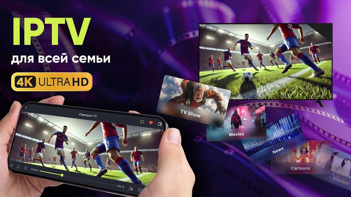 IPTV — ТВ Каналы и Плейлисты — прямая трансляция ТВ для всех устройств Android. Смотрите фильмы, новости, спортивные трансляции в высоком качестве. Медиаплеер IP TV, поддерживающий форматы M3U, M3U8 Chromecast и Google Cast. Просматривайте плейлисты с каналами в 4К.