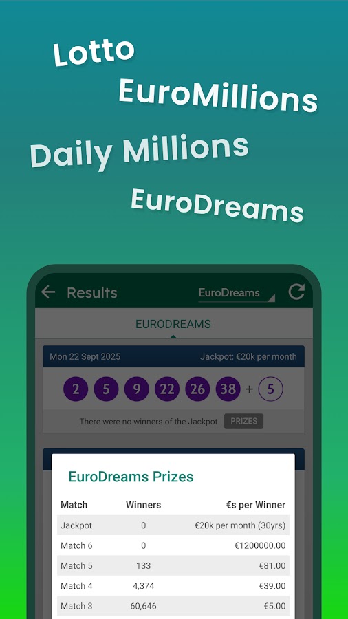 ★ Последние результаты — смотрите результаты лотерей в режиме реального времени, EuroMillions, EuroDreams и Daily Million. Каждый тираж включает полную разбивку выигрышей, чтобы вы точно знали, сколько выиграли.