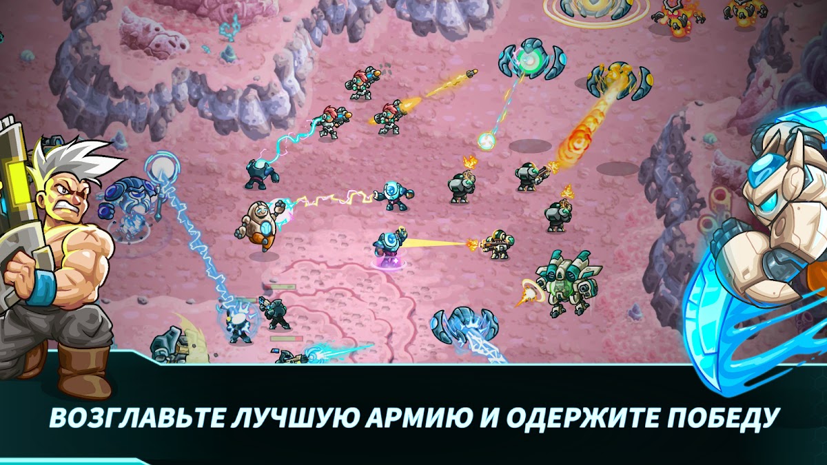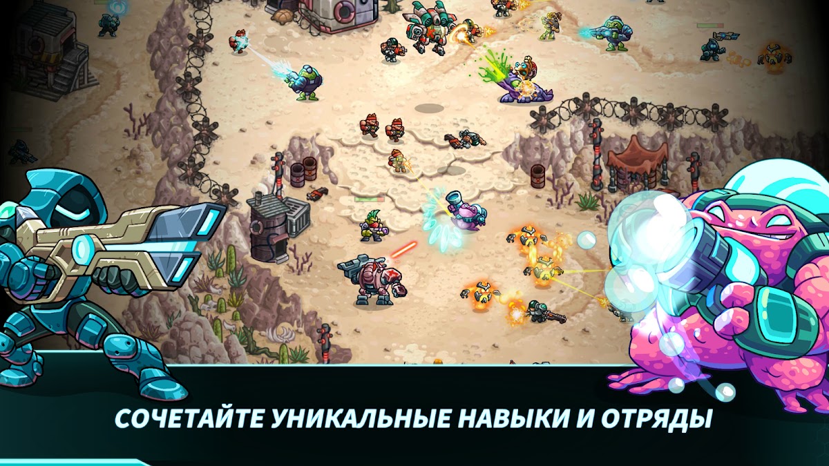 — Тактика вашей армии может взлететь до звезд благодаря 8 видам специального оружия! Установите свой план игры и используйте мгновенное оружие: дробовики, ядовитые бомбы или даже предприятия беспилотников.
