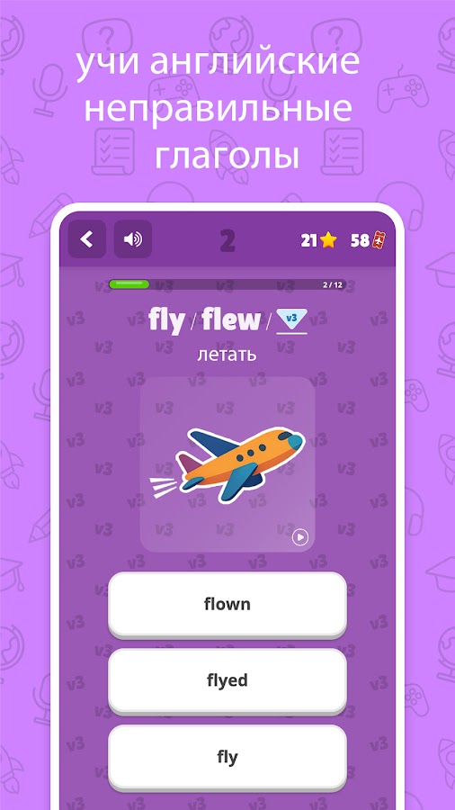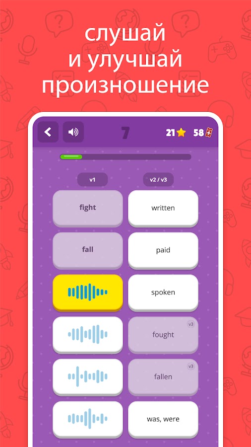 👂 Слушай и учись: Играй в нашу игру «Слушай и Соотнеси», чтобы развивать навыки восприятия на слух и одновременно слушать безупречное произношение неправильных глаголов. Наше приложение поможет тебе не просто читать глаголы, а действительно понимать нюансы их звучания.