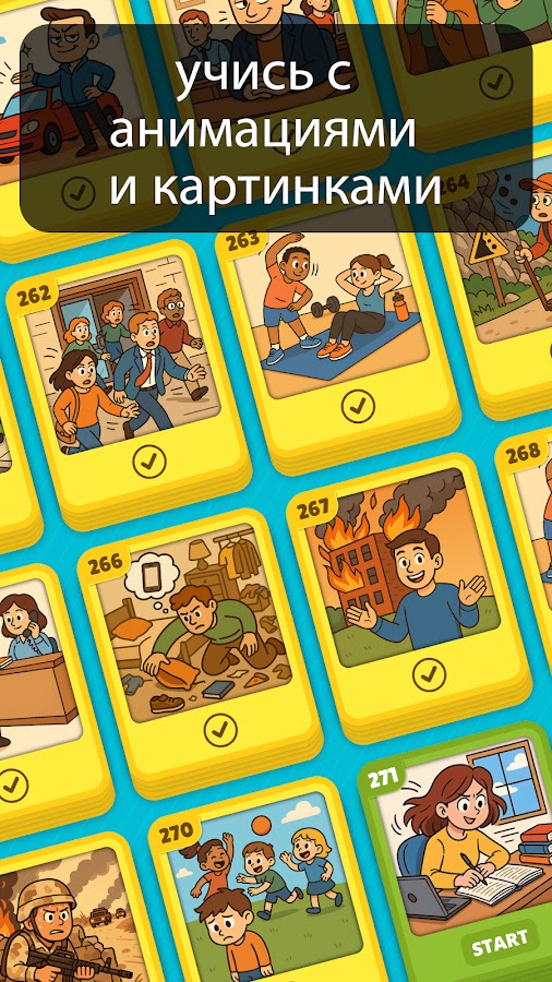 💥 Смотри и учись: Анимации в нашем приложении показывают, как английский используется в реальных ситуациях. Вместо того чтобы просто читать или слушать, ты смотришь, как используются слова. Это помогает легче понимать и запоминать новые фразы. Всё ощущается более естественно, словно ты учишь язык в реальной жизни. Видя действия, ты учишься быстрее и увереннее.