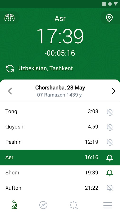 Namoz vaqtlari — joylashuvingizga qarab aniqlanadi.