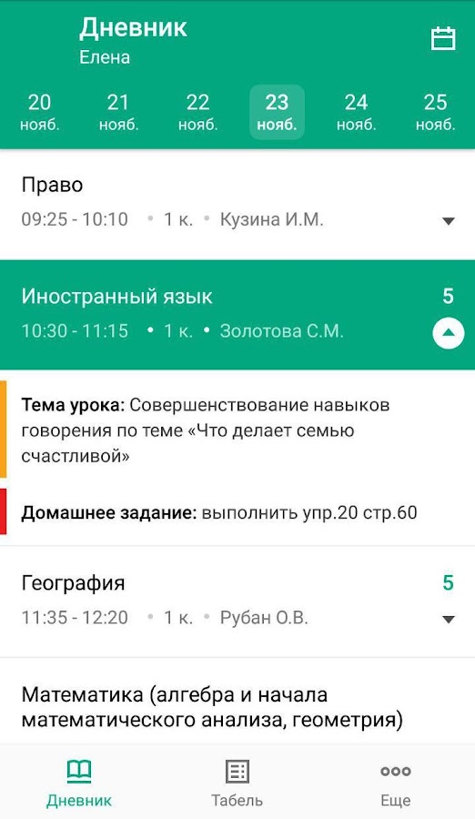Дневник. В дневнике Вы найдете домашние задания, оценки, темы занятий по каждому предмету, а также узнаете какие занятия будут проводиться завтра, послезавтра и в другие дни. По всем предметам будет указано время проведения занятия, номер кабинета, где будет проходить урок, и ФИО преподавателя.