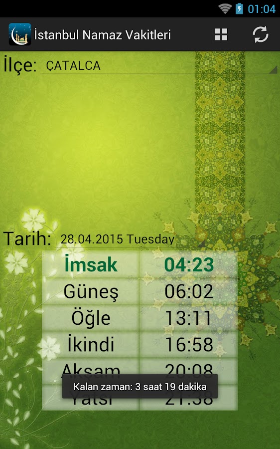 Когда вы входите в приложение, автоматически открывается время молитв в этом городе, независимо от того, какой район вы выбрали последним. Так что вам не придется каждый раз выбирать, где жить. (Если вы не живете в близлежащих районах, выберите «Стамбул» в качестве района.)