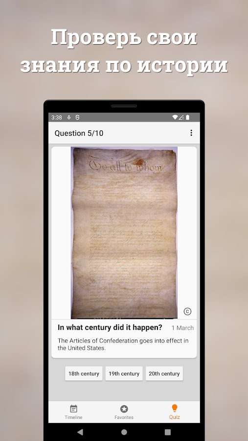 • Викторина: Проверьте свои знания истории с помощью викторин, разработанных специально для вас. Испытайте себя, отвечая на разнообразные исторические вопросы, и станьте мастером истории.