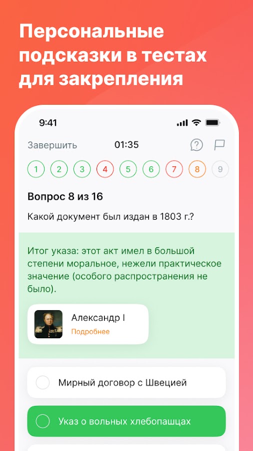 Приложение идеально подойдет для подготовки к ЕГЭ и ОГЭ по истории. Вся теория разбита на темы и разделы, например, исторические личности, термины, список дат истории России и мира, архитектура и живопись. Каждый текст и статью дополняет практика: задания и тесты для проверки и закрепления знаний.